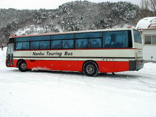 八戸十一日町から乗ってきた高速バス?「南軽号」は、 道の駅しちのへで休憩のため5分ほど停車します。 車両は南部バスの色ですが、実は元八戸市営バスの貸切車 だったりします。 バス車内には料金箱は設置されていません。 おまけに車内後方のシートはサロン仕様になっていて、 座席を動かすと、座席が横方向に向きが変えられる構造のまま 残されていましたので、 サロンカーとしても利用できますが、そんなことをやると運転手 さんに怒られますので、やめておきましょうね。 |