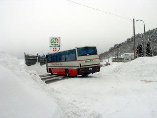 もう少し近づいてバス停の反対側から写真を撮影してみます。 すると反対側も同じように雪に埋もれています。 でも、よくよく考えるとまともな積雪がこれほどの量があった わけではなく、ドライブイン内を除雪した雪の山がバス停近くに 寄せ集められていたものなんですよね、きっと。 それにしても、凄い雪です・・・。 |