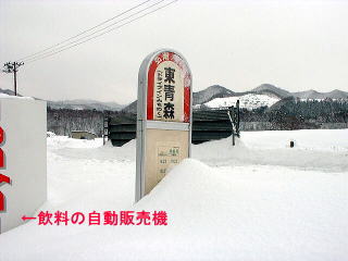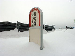 まずは下車した記念に東青森バス停の標識の写真を撮影 します。 凄いですねー! 雪のために半分ほど埋まっています。 どれだけ積雪があったのか想像できるでしょうか? 左側に写っているのが自動販売機なんですが、これと並んでも 半分程度埋まっていることが分かると思います。 |