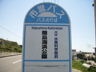 白浜海水浴場から蕪島への最寄りバス停に到着 しました。 ここで降りた目的は、今の季節しか見られない 1年で最も美しく、賑やかな景色を堪能したいから なのでした。 |